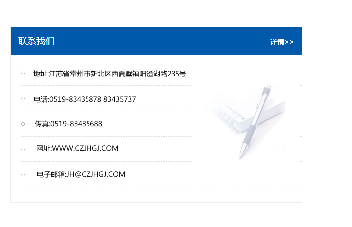 地址:常州市新北區友邦商務大廈1幢16、17層  電話:0519-85101652  傳真:0519-85112595  郵編:213022  網址:www.cz-jiayue_cn.dllq55.com  郵箱:xiajifengaa@163.com